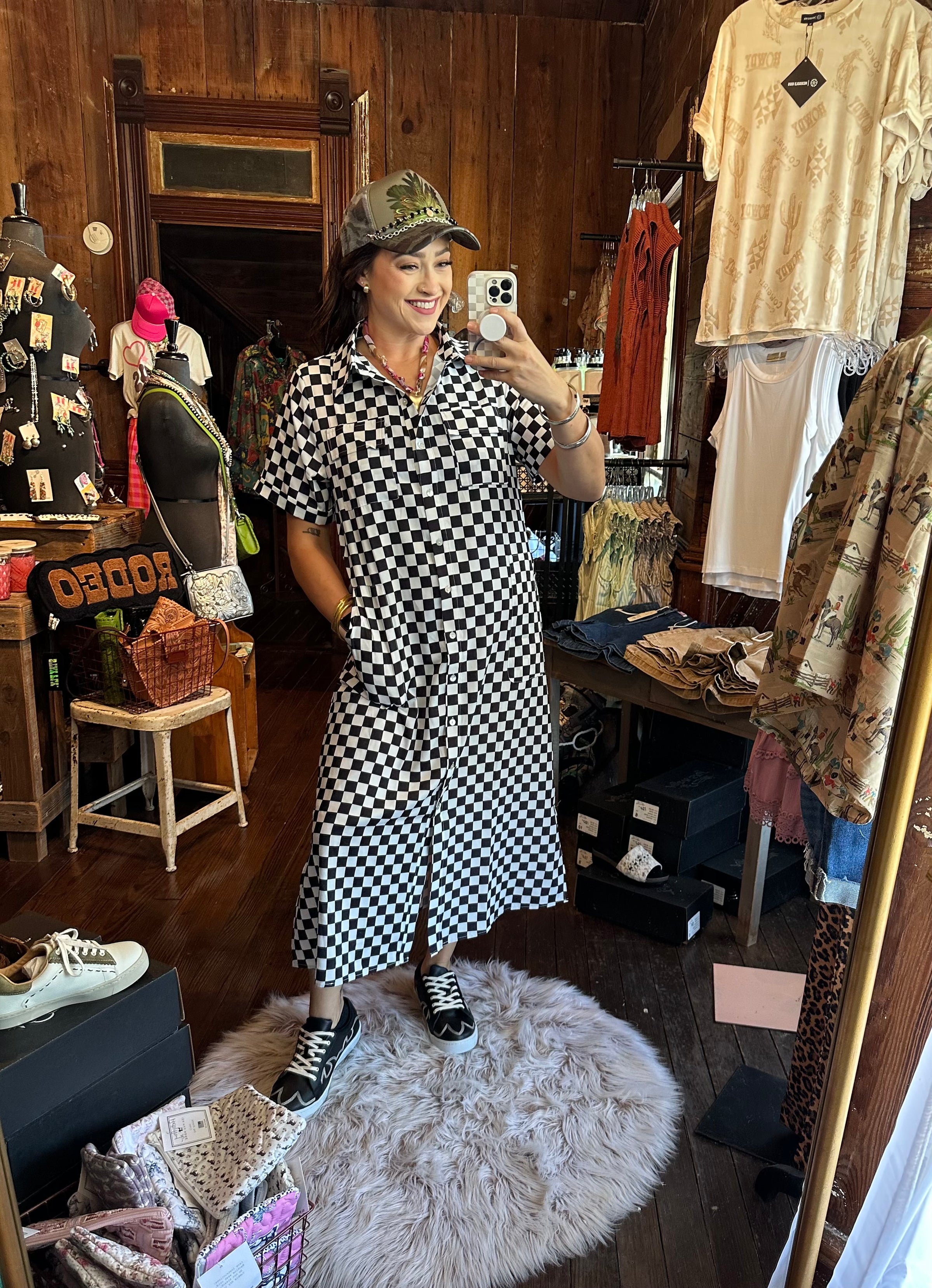 Check out this super fun black and white check button down dress. You can style it so many ways.