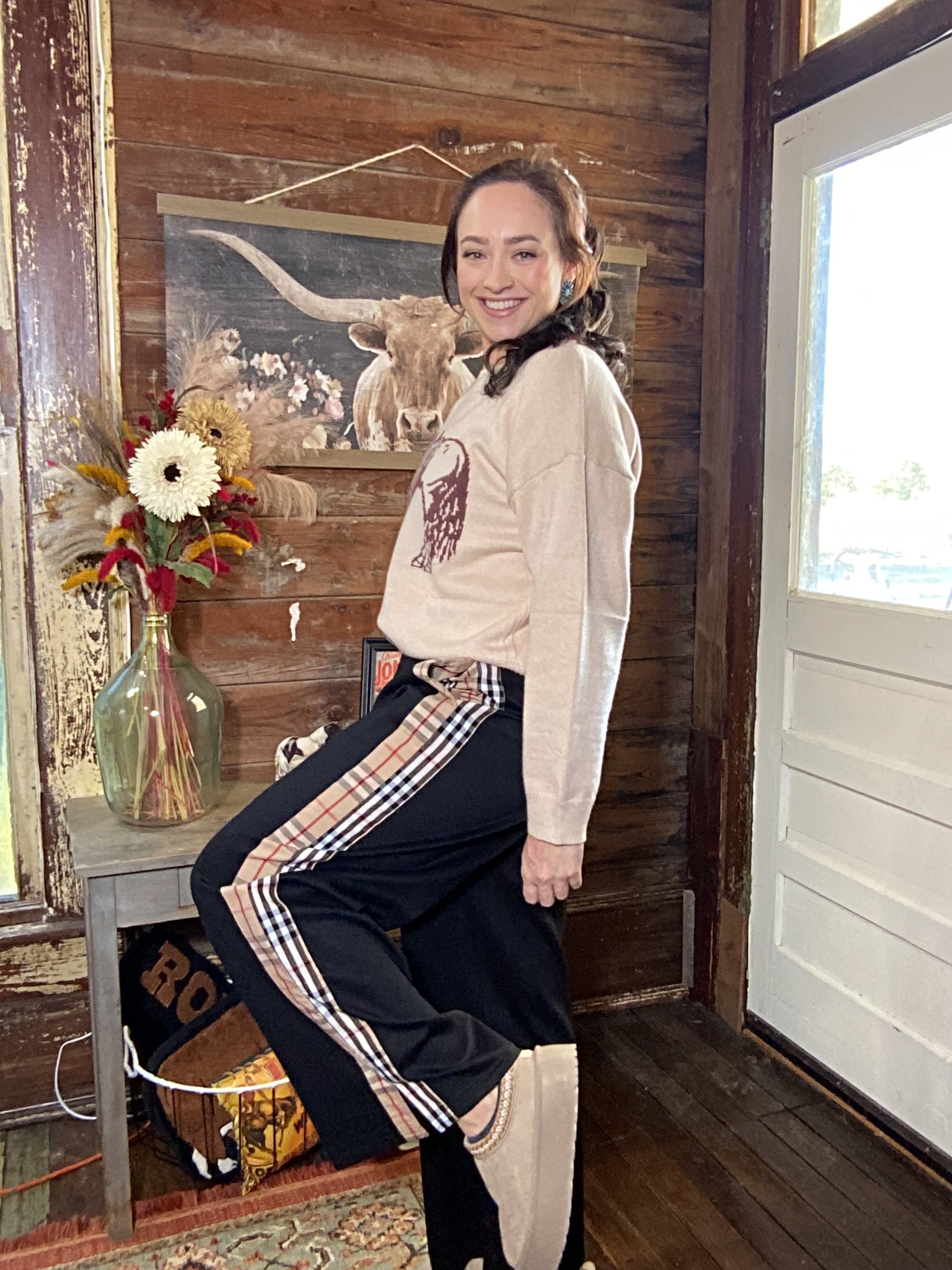 Elastic waist band with decorative plaid strip down the leg side