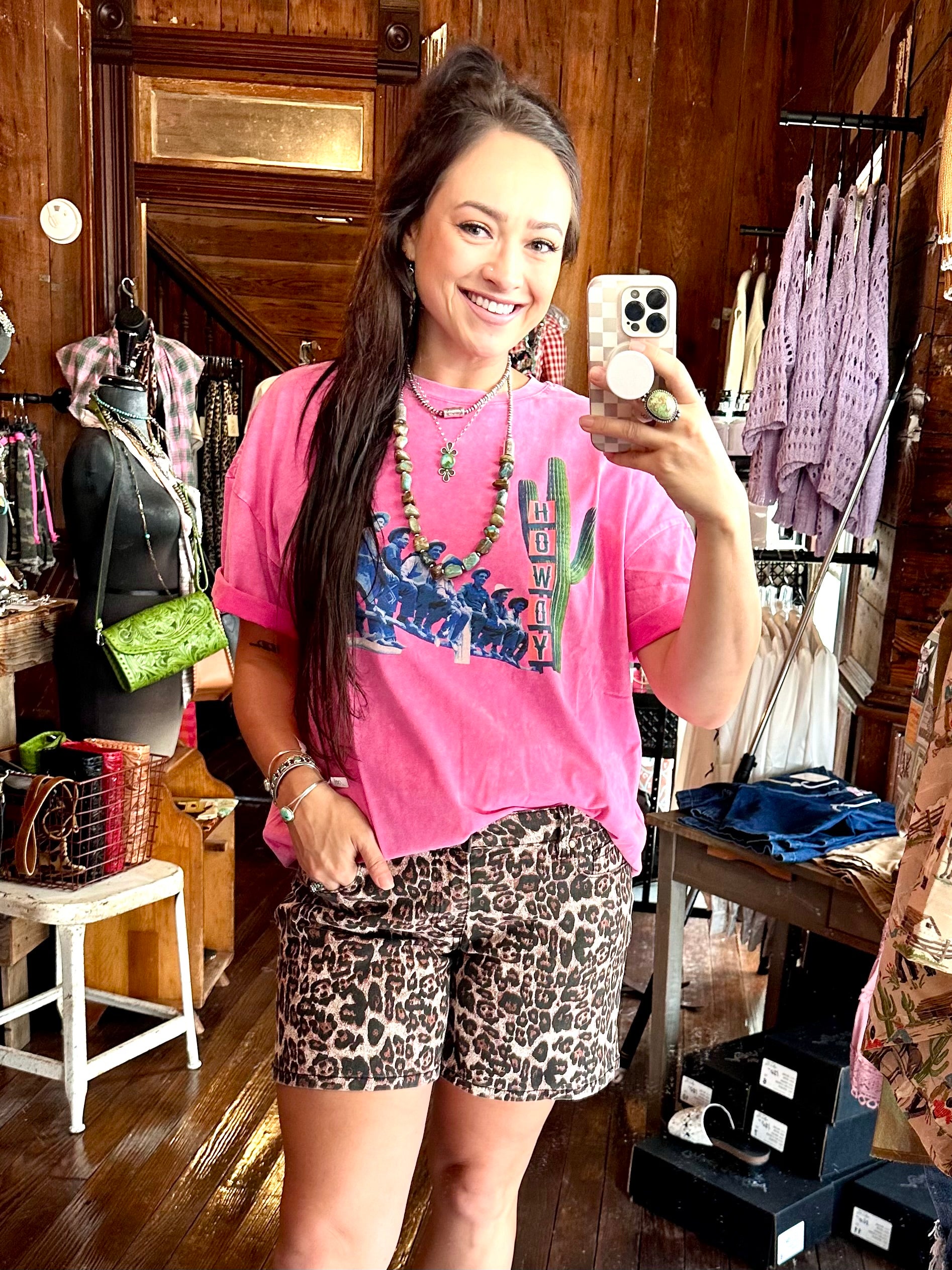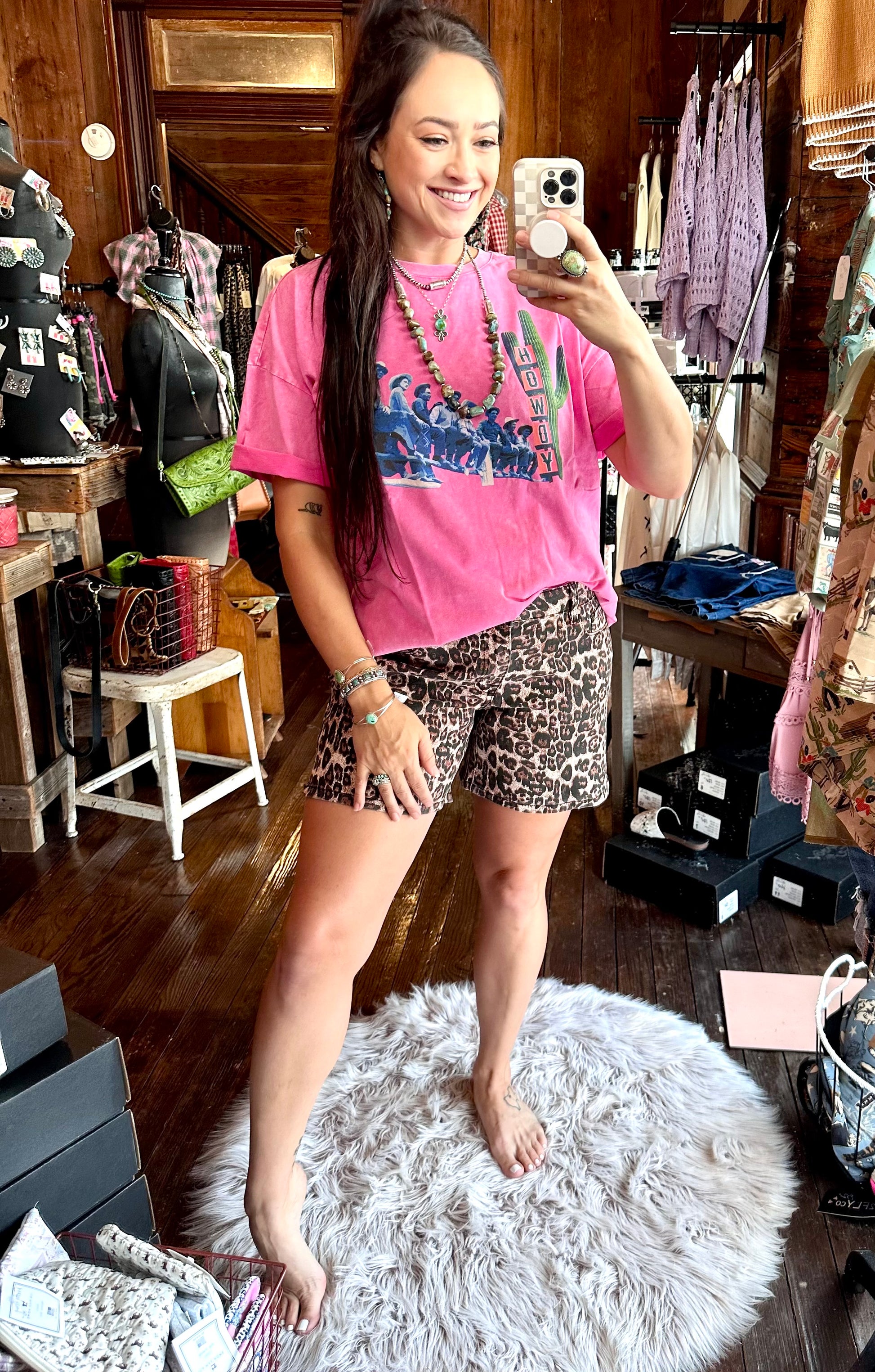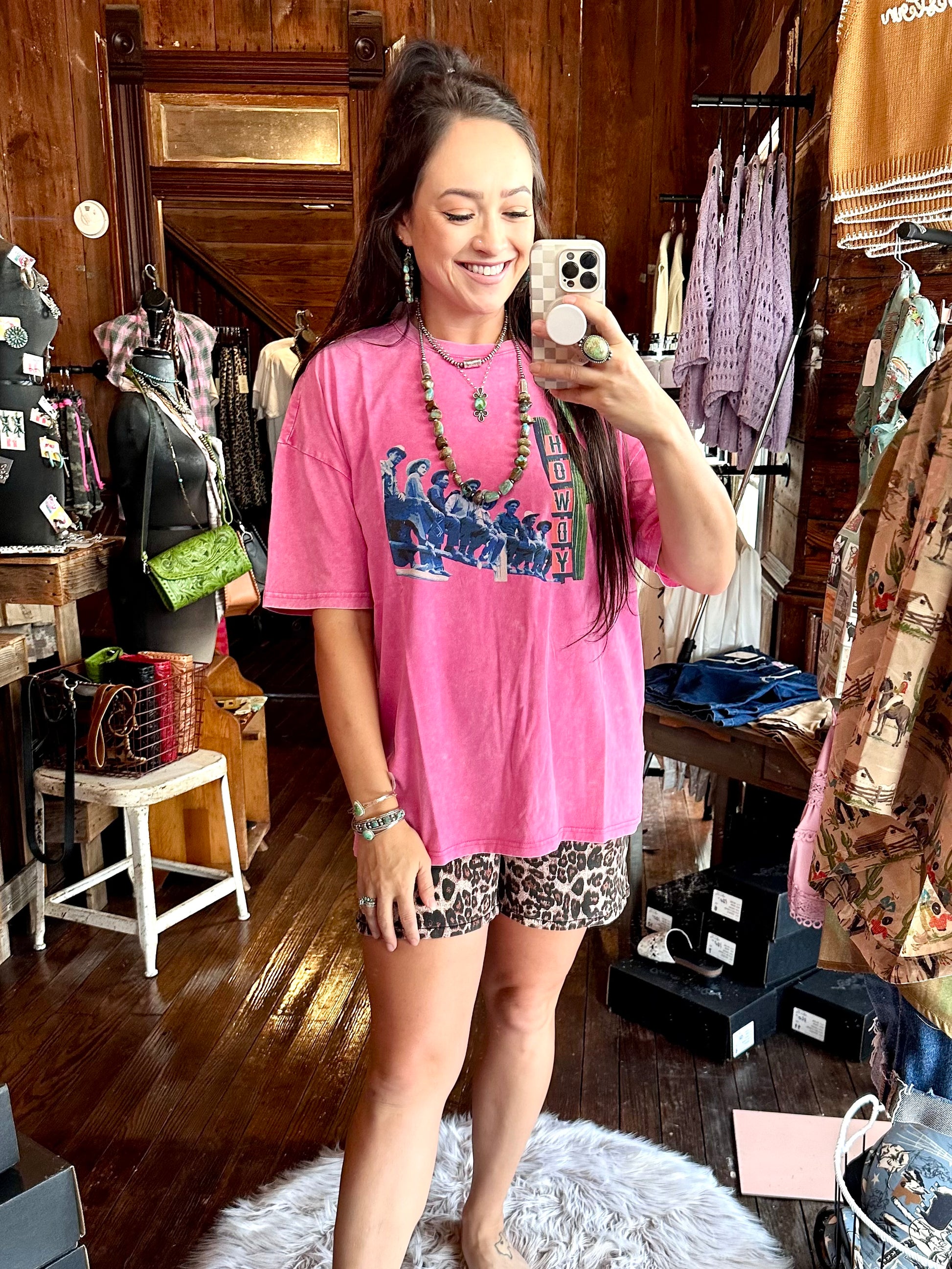 Mineral washed oversized tee with cowboys and cowgirls sitting on the fence.