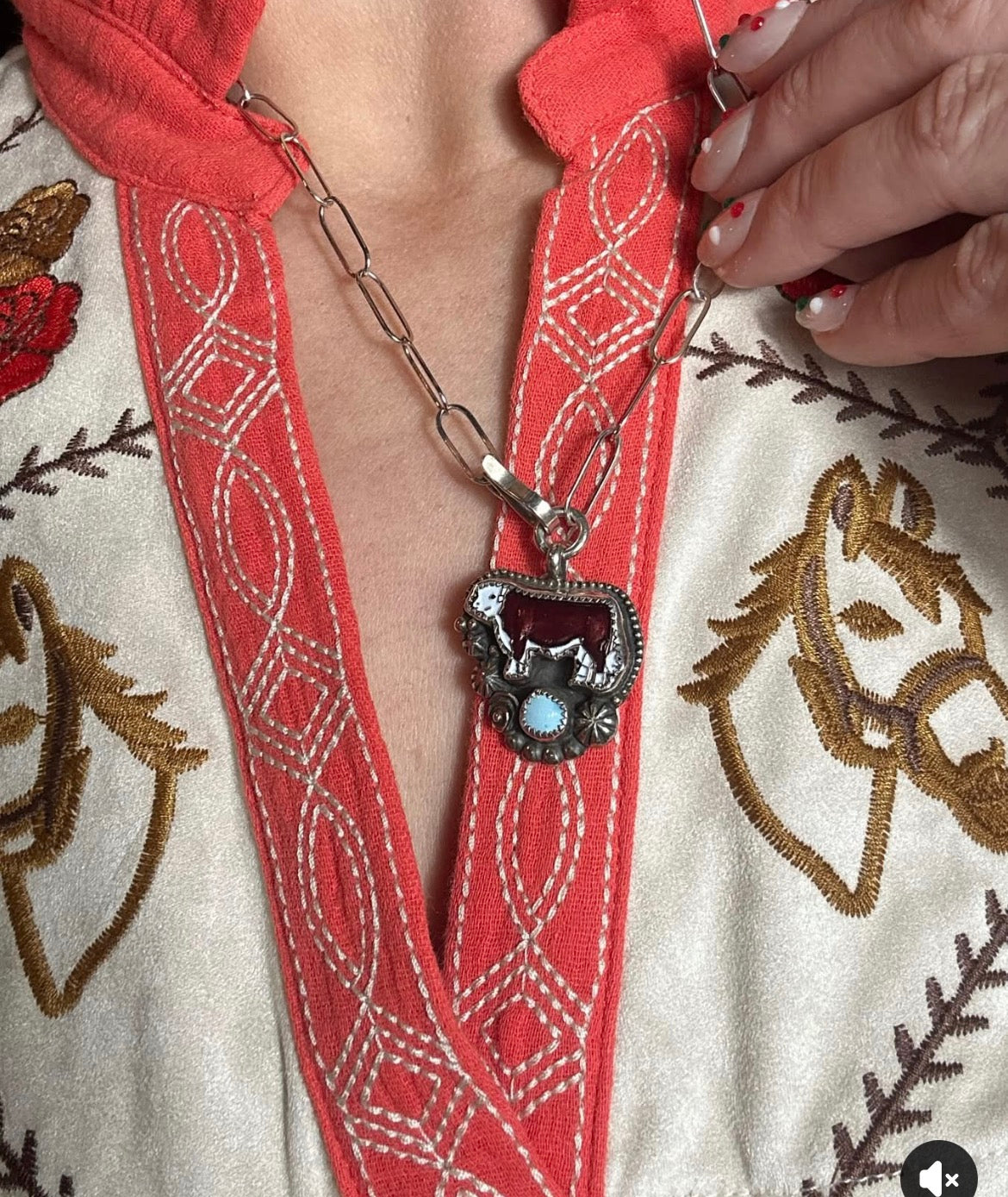 Solid sterling silver link chain with porcelain Hereford inset in a silver setting.