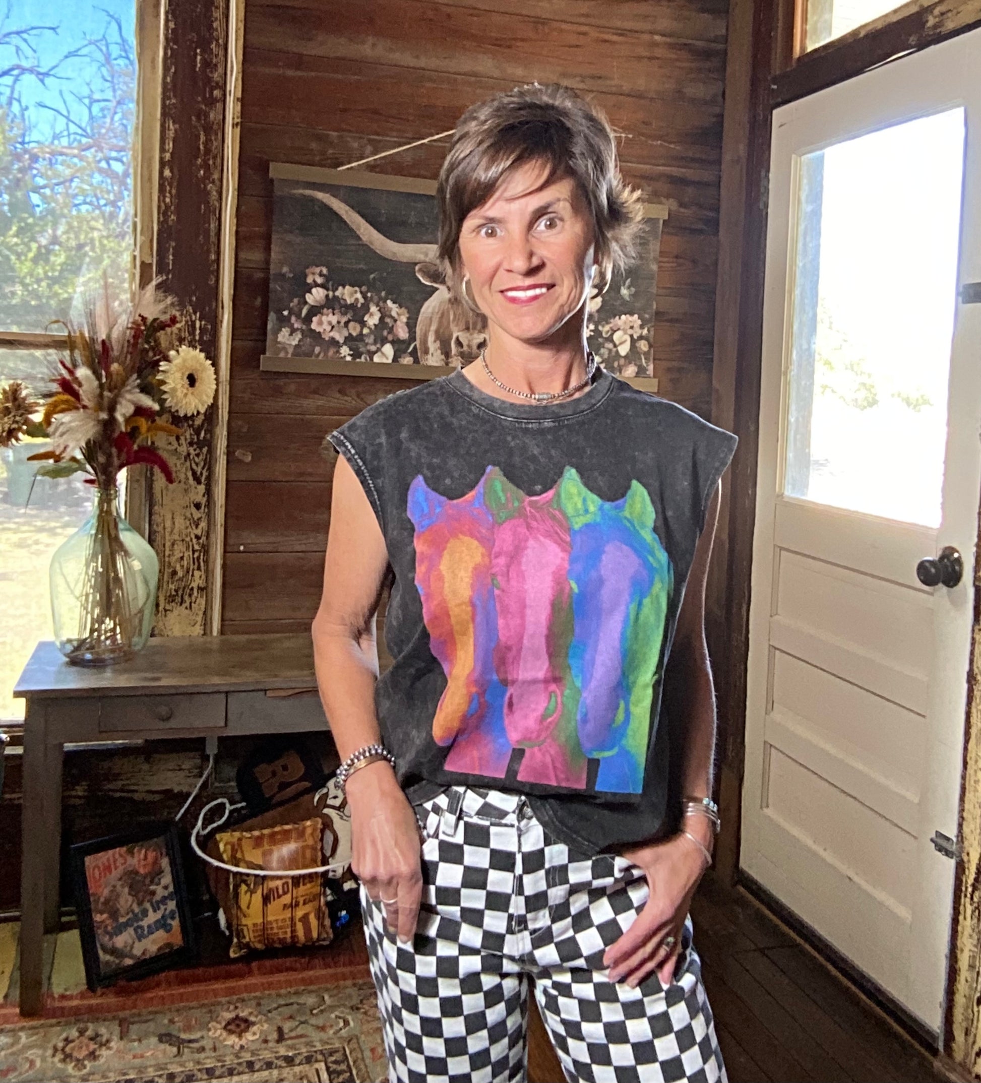 Faded black boxy tank with neon horse head screen print.