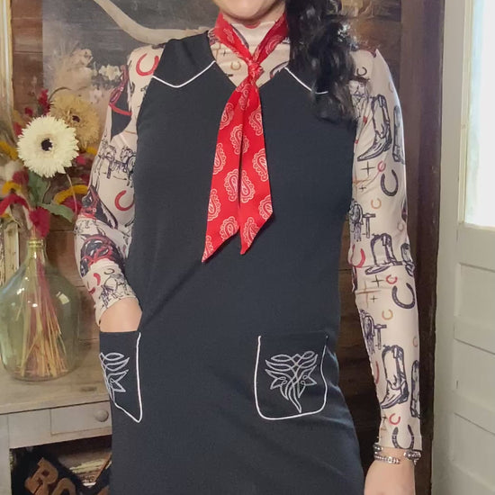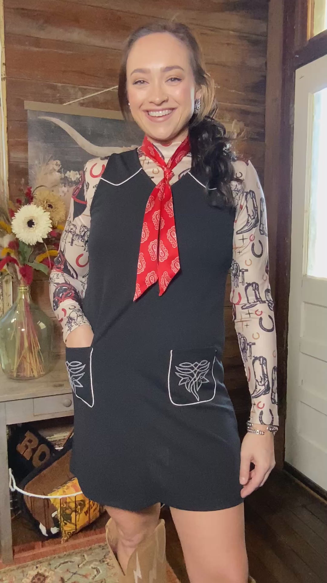 Super cute and stretchy little black dress with yoke details and boot stitch pockets