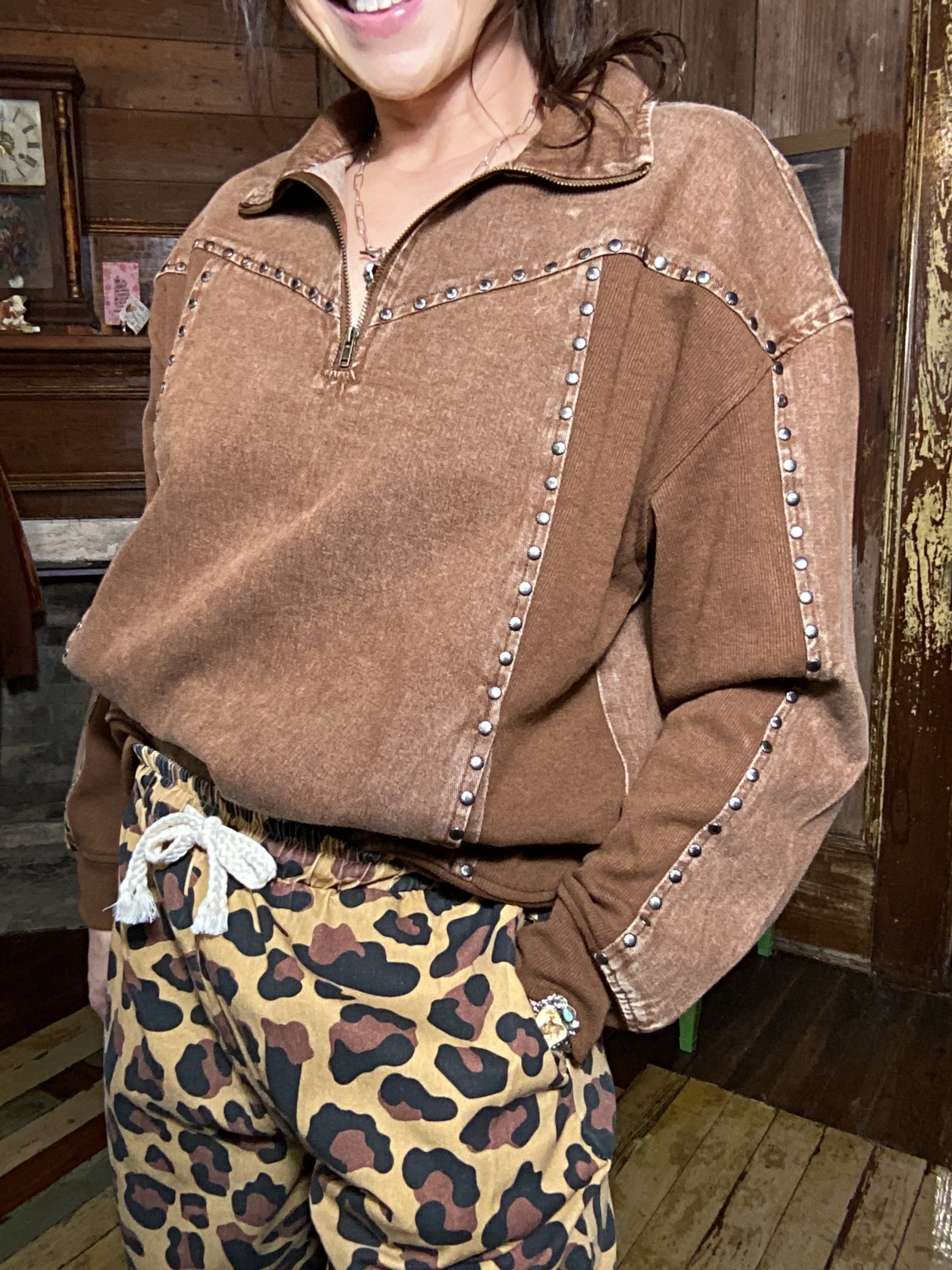 Faded black or chocolate denim 1/4 zip pullover